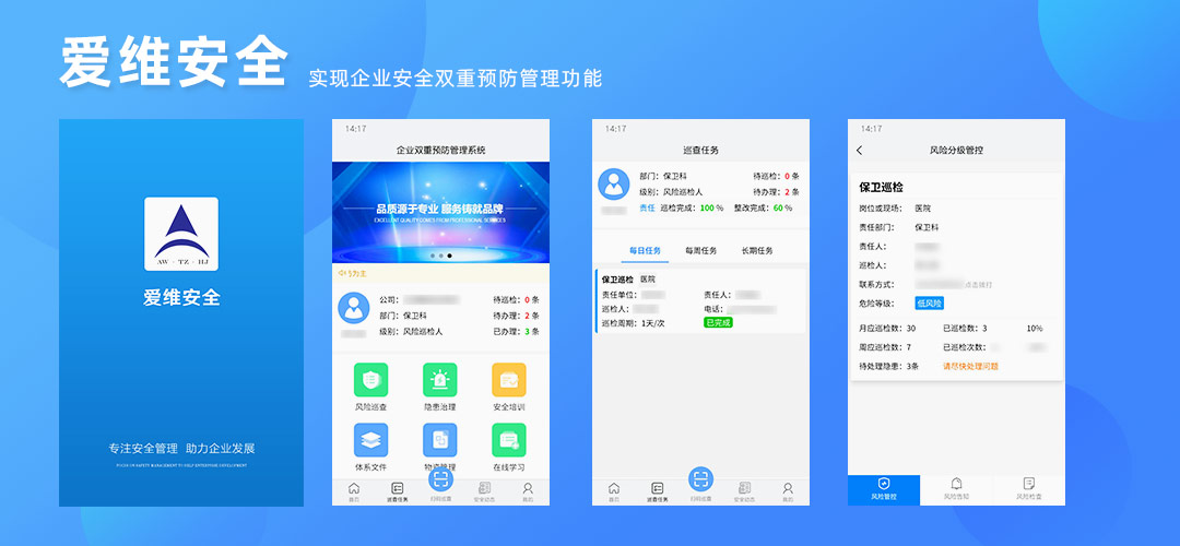 爱维智慧安全双重预防管理系统由河南爱维安环科技有限公司开发建设,以APP、微信和PC端形式,实现企业安全双重预防管理功能,实现安全信息记录、隐患处理、实时监测、数据统计分析等功能。